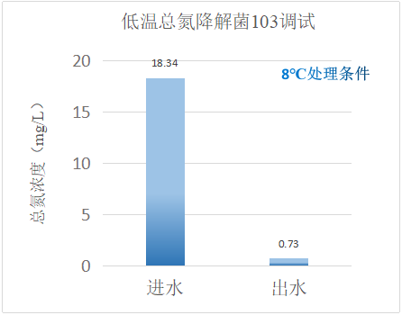 通過技術(shù)人員現(xiàn)場(chǎng)投加低溫總氮降解菌103,再配合現(xiàn)場(chǎng)生化系統(tǒng)運(yùn)行條件控制、優(yōu)化,達(dá)到如下效果: