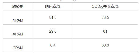 在上述最佳條件下,3組水樣分別投加1mL的陰離子型聚丙烯酰胺(APAM)、陽離子型聚丙烯酰胺(CPAM)、非離子型聚丙烯酰胺(NPAM),(3種助凝劑濃度均為0.5%) , 300r/min快速攪拌1min, 90r/min慢速攪拌10min, 靜止沉降15 min, 結(jié)果見表。